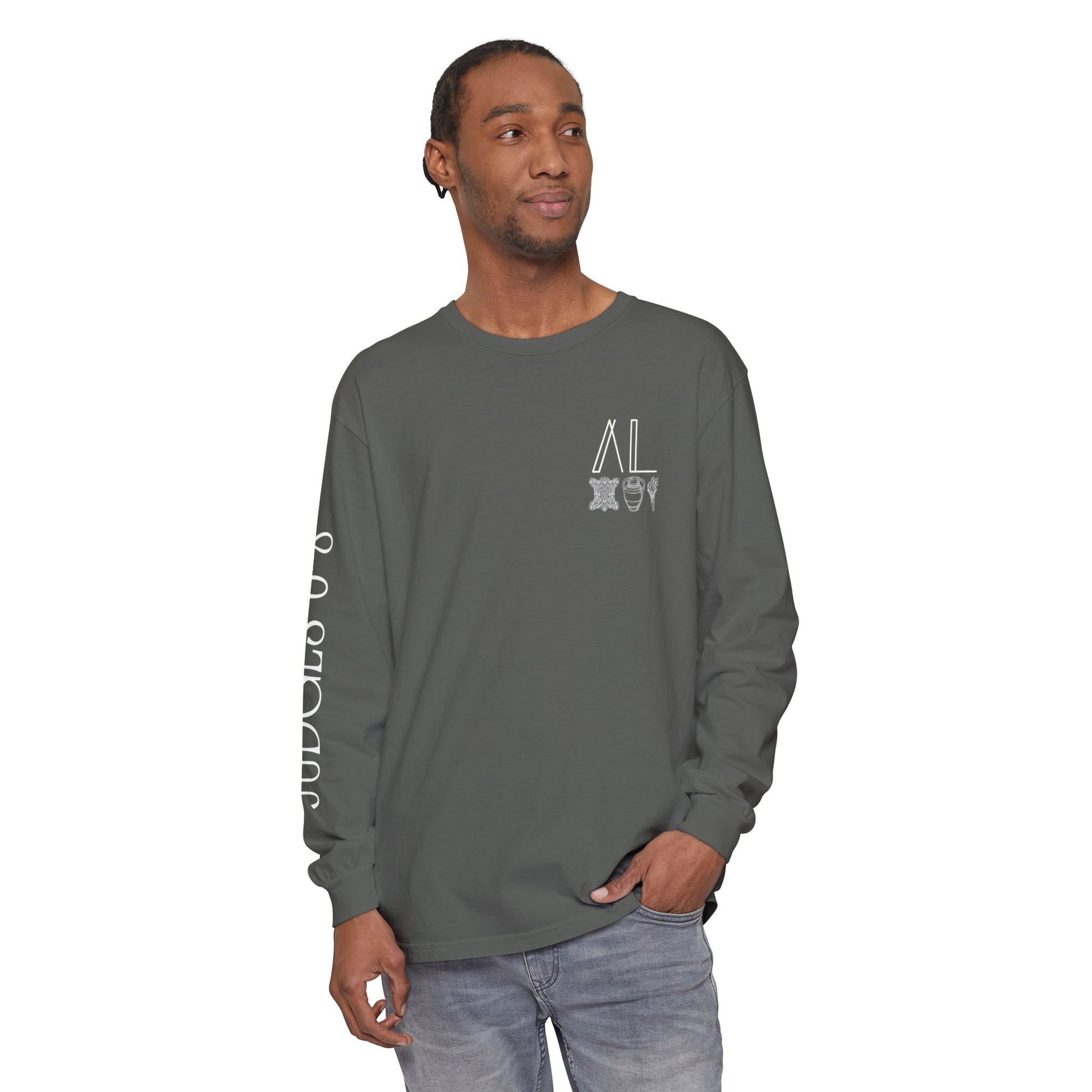 The soft, lived-in color and medium-weight ring-spun cotton drape comfortably while the classic fit keeps the silhouette relaxed. The design reads like a personal crest, steady and unassuming. Slim text runs down one sleeve for a subtle, collegiate feel. It’s the kind of long sleeve you reach for when you want something durable yet gentle, a wearable statement that settles into your rotation and ages beautifully with time.